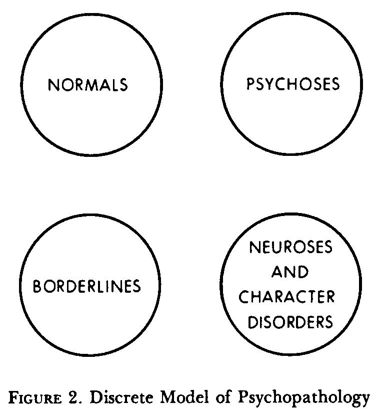 The most common concept of borderline is based on a continuum or dimensional model of psychopathology, as is represented in Figure 1. In simplest terms, behavior or psychological functioning is viewed as ranging from normal to severely psychotic. Menninger has used this model exclusively in classifying mental disorders in his book The Vital Balance (Menninger, Mayman, and Pruyser, 1963). Neuroses and character disorder are placed toward the normal end of this continuum. Borderline refers to a disorder with greater severity than neurosis and character disorder but less severity than psychosis. This concept is used by Grinker, Werbie, and Drye (1968). Their four subgroups can be considered as defining subsections on a segment of this continuum, with their Group I on the border with psychoses and Group IV on the border with neuroses. A second model-the typological model-suggests that psychopathology can best be organized into discrete groups not representing a continuum or having any other specific relation to each other (see Figure 2). In this model, nosologic groups are delineated from each other and from normals on the basis of a supposedly qualitative unique characteristic feature. Any pathologic manifestation could range from mild to marked within the group, but the presence of distinguishing features rather than their severity is critical to diagnosis. This model does not imply that no similar psychopathologic features are to be found between groups (e.g., anxiety is almost ubiquitous across diagnostic classes), only that distinguishing features identify patients as belonging to a discrete class. The theoretical implications of these two concepts are quite different. The first model encourages a search for points on the continuum which can usefully be defined and distinguished from other points. One assumes there will be confusing cases at the interface between any two defined points, and that locating such a boundary case in either group would not be entirely misleading. In contrast, a typologic or discontinuous model of psychopathology does not allow for the intermediate case, and hence the implications are more drastic. An incorrect classification would be entirely misleading, rather than simply underestimating or overestimating the severity of psychopathology. There could be confusing cases, however, either because the disease is only partially manifest or because the patient was simultaneously afflicted with two illnesses. Considerable evidence has now emerged suggesting some discrete classes of psychopathology. Genetic studies (adoptive, cross-fostering, and family-tree) document that manic-depressive and schizophrenic illness are discrete, and this distinction is supported by differential psychopharmacologic responsivity. On the other hand, if one looks at these two illnesses from a descriptive or an egopsychologic point of view, phenomenologic and ontogenetic observations can be readily conceptualized on a continuum. The concept of schizophrenia spectrum (Kety et al., 1968), derived from genetic investigations, lends support to a continuous model of psychopathology. In the continuum model the question is whether borderline is a useful segment to delineate. There is no question about the existence of a borderline as there is a border between any two sequential points. The question is pragmatic: Does defining the characteristics of the border provide useful information in terms of etiology, course, or treatment? Is assigning a borderline diagnosis more helpful than diagnosing these patients as either neurotic or psychotic, or relegating them to an uncertain diagnostic status? If we use a discontinuous model, on the other hand, then we must prove that such a group exists. Nosology implies a capacity to generalize from group membership. Assignment to an invalid class would be totally misleading. The use of borderline as a diagnosis if this category is inadequately defined has different implications in the two models discussed. On a continuum model, a poorly defined point would lead to sloppy diagnostic practices reducing the usefulness of the better-defined surrounding points. In the discontinuous model a poorly defined entity would have little chance of being validated, hence its existence as well as usefulness would be in question. A third model for classification combines the properties of the continuum and typological approaches. Such a combined or mixed model provides the means for integrating the presently available conflicting data relevant to psychiatric nosology. A mixed model can define two levels-a continuous and a discrete level- allowing one to conceptualize disordered ego functioning and character development along a severity continuum but hypothesizing that at certain segments of this continuum psychopathologic manifestations (e.g., highly distinguishing signs and symptoms) may arise to identify discrete nosologic classes. Currently we favor a mixed model