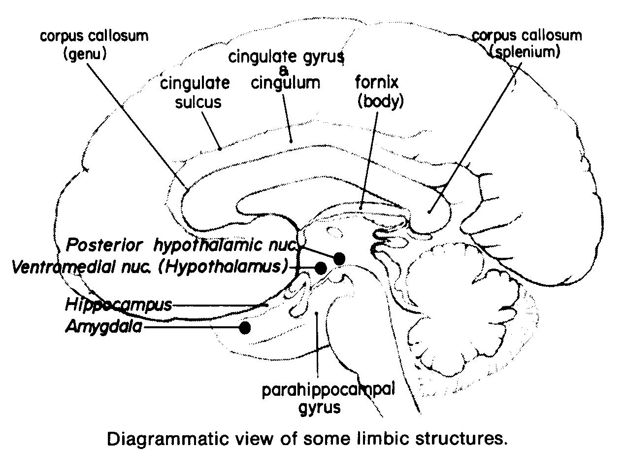 lobe, the hypothalamus, the fornix, the cingulate gyri and cingulate bundle, the