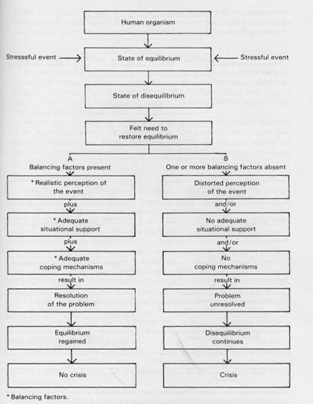Section 6 Question 6 | Answer Booklet | Table of Contents According to Caplan (1964:40), there are four developmental phases in a crisis: Whenever a stressful event occurs, there are certain recognized balancing factors that can effect a return to equilibrium; these are perception of the event, available situational supports, and coping mechanisms as shown in Fig. 1. The upper portion of the paradigm illustrates the "normal" initial reaction of an individual to a stressful event. A stressful event is seldom so clearly defined that its source can be determined immediately. Internalized changes occur at the same time as the externally provoked F stress, and as a result, some events may cause a strong emotional response in one person, yet leave another apparently unaffected. Much is determined by the presence or absence of factors that can effect a return to equilibrium. In column A of Fig. 1 the balancing factors are operating and crisis is avoided. However, in column B the absence of one or more of these balancing factors may block resolution of the problem, thus increasing disequilibrium and precipitating crisis.