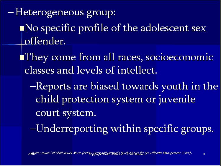 Caldwell, M. F. (2016). Quantifying the decline in juvenile sexual recidivism rates.Psychology, Public Policy, and Law, 22(4), 414–426.