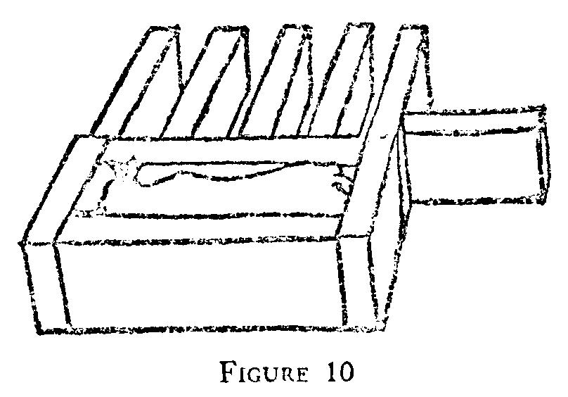 At first Mary again smiles bashfully at me. Again she turns her head away, holding on to her mother's hand and insisting that the mother come with her into the room. Once in the room, however, she lets her mother's hand go and, forgetting about the mother's and my presence, she begins to play animatedly and with obvious determination and goal-mindedness. I quickly close the door and motion the mother to sit down, because I do not want to disturb the play. Mary goes to the corner where the blocks are on the floor. She selects two blocks and arranges them in such a way that she can stand on them each time she comes to the corner to pick up more blocks. Thus, play begins again with an extension of extremities, this time her feet. She now collects a pile of blocks in the middle of the room, moving to the corner and back without hesitation. Then she kneels on the floor and builds a small house for a toy cow. For about a quarter of an hour she is completely absorbed in the task of arranging the house so that it is strictly rectangular and at the same time fits tightly about a toy cow. She then adds five blocks to one long side of the house and experiments with a sixth block until its position satisfies her (see Figure 10). This time, then, the dominant emotional note is peaceful play concentration with a certain maternal quality of care and order. There is no climax of excitement, and the play ends on a note of satiation; she has built something, she likes it, now the play is over. She gets up with a radiant smile - which suddenly gives place to a mischievous twinkle. I do not realize the danger I am about to fall victim to, because I am too fascinated by the fact that the close-fitting stable looks like a hand - with a sixth finger. At the same time it expresses the "inclusive" mode, a female-protective configuration, corresponding to the baskets and boxes and cradles arranged by little and big girls to give comfort to small things. Thus we see, so I muse, two restorations in one: The configuration puts the finger back on the hand and the happily feminine pattern belies the "loss from the genital region" previously dramatized. The second hour's play thus accomplishes an expression of restoration and safety - and this concerning the same body parts (hand, genital region) which in the play disruption of the first hour had appeared as endangered. But, as I said, Mary has begun to look teasingly at me. She now laughs, takes her mother's hand and pulls her out of the room, saying with determination, "Mommy, come out." I wait for a while, then look out into the waiting room. A loud and triumphant, "Thtay in there!" greets me. I strategically withdraw, whereupon Mary closes the door with a bang. Two further attempts on my part to leave my room are greeted in the same way. She has me cornered. There is nothing to do but to enter into the spirit of the game. I open the door slightly, quickly push the toy cow through the opening, make it squeak, and withdraw it. Mary is beside herself with pleasure and insists that the game be repeated a few times. She gets her wish, then it is time for her to go home. When she leaves she looks triumphantly and yet affectionately at me and promises to come back. I am left with the task of figuring out what has happened. From anxiety in the autosphere in the first hour, Mary had now graduated to satiation in the microsphere - and to triumph in the macrosphere. She had taken the mother out of my space and locked me into it. This game had as content: a man is teasingly locked into his room. It was only in connection with this playful superiority that Mary had decided to talk to me, and this in no uncertain terms. "Thtay in there!" were the first words she had ever addressed to me! They were said clearly and in a loud voice, as if something in her had waited for the moment when she would be free enough to say them. What