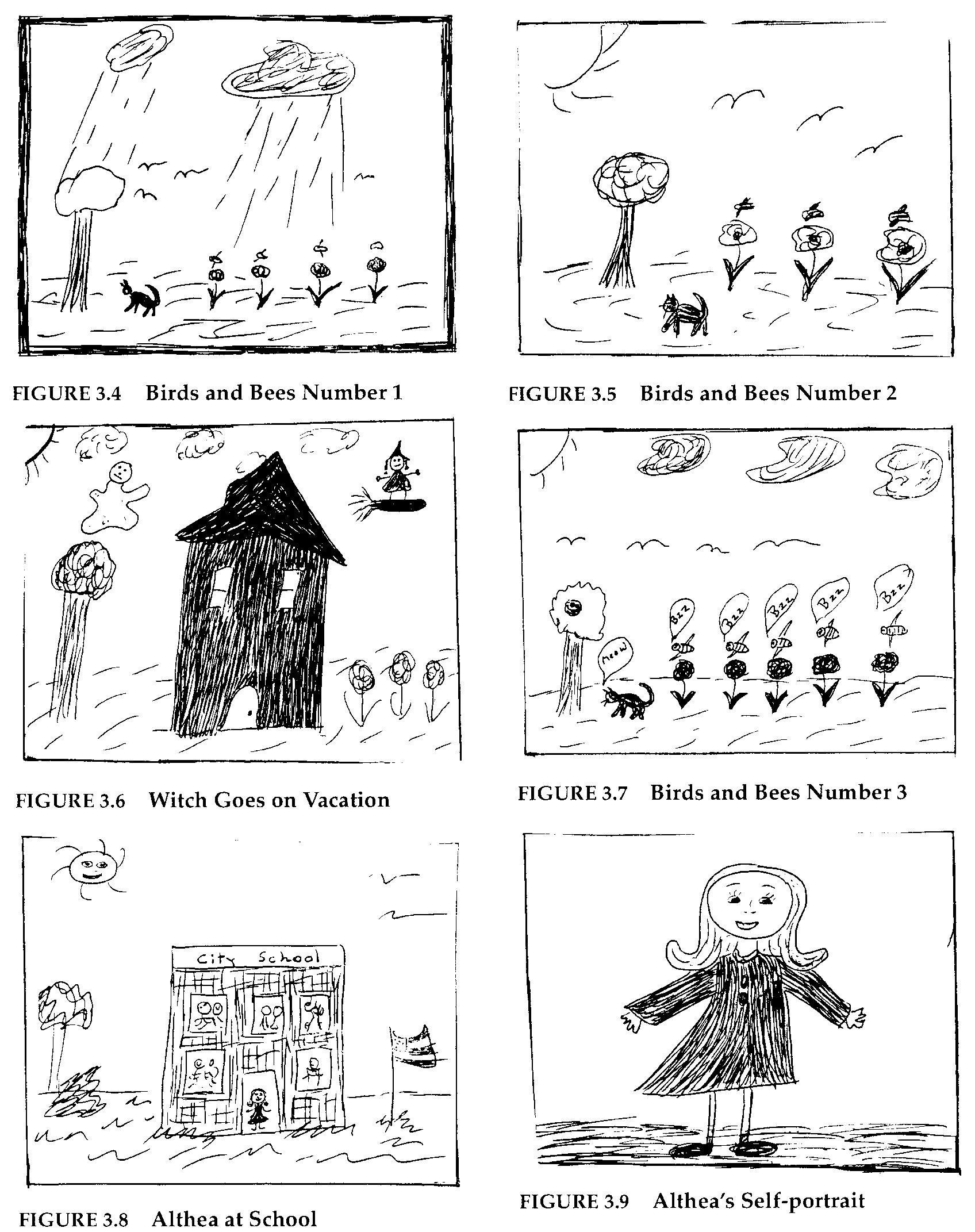 Figures 3.4, 3.5, and 3.7 pick up a recurring sexual theme of the birds and bees. This theme surfaced as the clinical social worker began dealing with the parents' marital problems and working with them to move Althea out of the marital bed and back to her own room. This six-month-long theme slowly shifted as Althea became increasingly comfortable with her parents' realignment in their couple and parental roles. In Figure 3.7, for example, the bees are loudly communicating.
