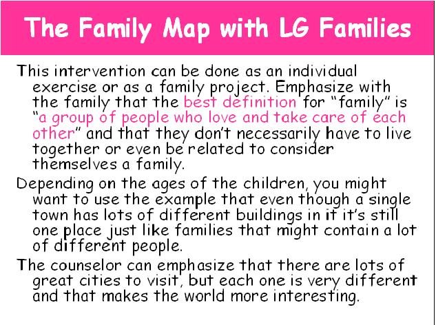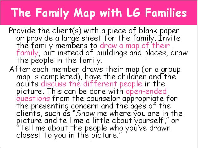 6 Question 6 | Test | Table of Contents One of the interventions that might work with the lesbian and gay families is called “The Family Map” and it’s main focus is on the best definition for family, “a group of people who love and take care of each other” and that’s a very simple definition if you are working with kids who are being treated poorly because their families are different, if you are working with parents who feel that their families or the community has made them feel different that they are not good enough parents or they’re not a real family. It’s a nice way to kind of create this activity where the family can create a map of themselves. And the thing on the ages for kids, you might want to use the example that even though a single town has lots of different buildings, it’s still one place. It’s still one place just like families contain a lot of different people, whether its two mothers, two fathers, eight grandparents, whatever it might be, it’s their family and it’s an okay family. The counselor can emphasize there are a lot of great cities to visit, but each one’s very different and kind of use that analogy that it’s okay to be different from the other places. To go to Chicago to get excitement, you come here to Portage or Chesterton for nice laid back suburban areas that can be close by but they don’t have to be the same, the variety is really appreciated. It can be an individual group activity and you give the client family a piece of paper and you tell them to draw a map of your family and include the people that matter to you. And right here like this tourist map where this is all Sedona, Arizona, but there are different parts of it so you know different buildings. If you are doing New York City, you can create the map and ask the kids or the family to write down where do people belong, draw the picture of people in your family. And after each member draws their map and the group map is completed, have the children and adults discuss the different people in the picture. You can ask open-ended questions. “Holly where are you in the map? Who is closest to you? Tell me why you put your two moms closest to you and your dad over here on this side.” You can ask questions to help them kind of talk about how they see their family and when you invite a child to do that, with the parents present, it can be really enlightening for the parents and sometimes it can make them feel better that they are doing an okay job with the kids or it can raise some red flags with the parents if they realize the child has got some issues going on with one of the step parents. So it’s a nice way to visualize each family because trying to talk to some kids about really intense, complicated relationships, for example, “Do you love your mother?” What’s Rose going to say? “Yes I do she’s here in the room.” “Do you love your father?” “I can’t say out loud because Mom will be upset.” So if you get them away to kind of draw their own map of their family, they can visually illustrate how they feel about those family members. Below