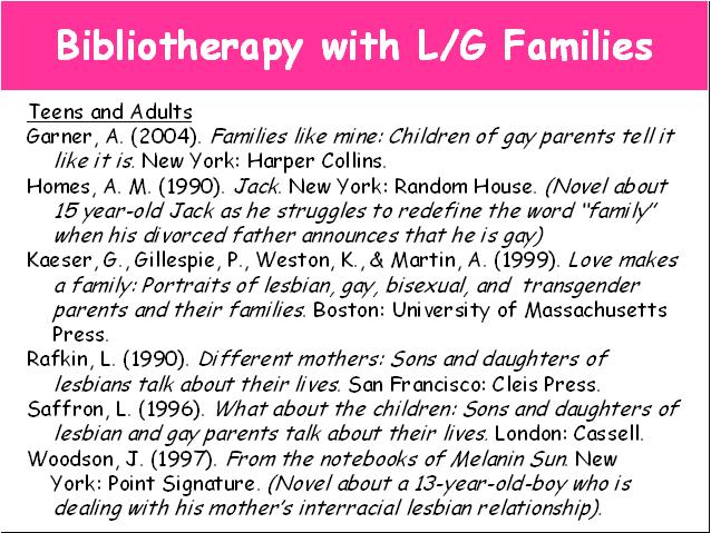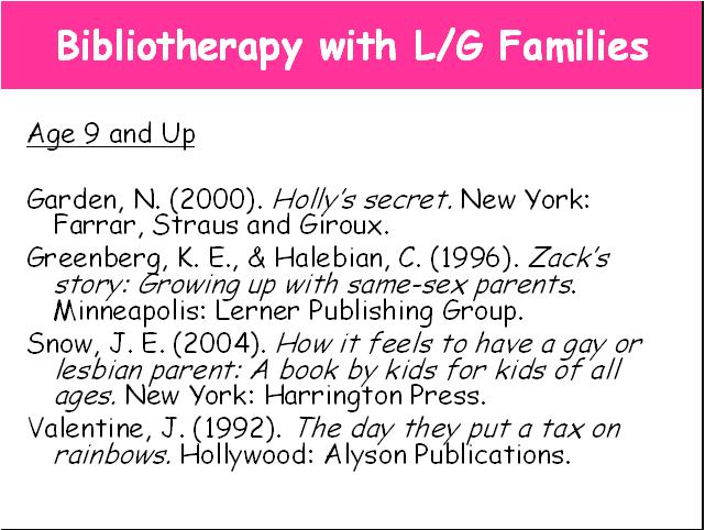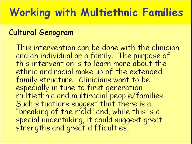 7 Question 7 | Test | Table of Contents Some of the website resources for kids and children in lesbian and gay families: http://www.colage.org/ and it’s for children of lesbian and gays and they have summer camps, places kids can go to be with kids similar to them in background and then http://www.familieslikemine.com/ is a website dedicated to decreasing isolation for people who have parents that are lesbian, gay, bi, or transgender and allows kids to kind of talk about their family. So it really makes it more acceptable. Bibliotherapy for kids from pre-school to eight, nine and up, teens, and adults there’s something out there if you are working with these families, there are a lot of resources available now that can help those families connect in with other families like themselves. Our next group of families which would be multi-ethnic, or we sometimes refer to them as multi-racial, inner-racial families. In the beginning we did talk about how many people identified as multi-ethnic on the last census, which was actually the first time people were allowed to do that in our nation’s history. Before you had to declare one ethnicity or the other, you couldn’t choose both. What they have found from that data is that multi-racial individuals are actually the fastest growing population in our country at this time. Part of that is due to the fact that interracial marriages have just become legal within the last forty of fifty years believe that or not. Many states still have laws on their books that would say you can’t marry someone of a different race. So as that’s become more socially acceptable, more individuals have entered interracial marriages and relationships and so there are more interracial children. This particular intervention is very neat. Anyone know what a basic genogram is? What’s a genogram? It’s like a family tree. They use little symbols and lines and you draw your genogram. The neat thing that we do here is that we do this either in your office with someone, have them take it home, do it together as a family, it can be an individual doing it, one of the children, it can be a couple, however you choose to use it. But the purpose is to get an idea of the ethnic and racial makeup of their extended family structure, not just race either but are you Polish, are you German, bring in all of that to show the diversity within your family. What you want to especially tune into is that there are the first generation of multi-ethnic or multiracial people and families. These are the first people who’ve kind of broke the mold within the family, they’ve kind of stepped outside of what is considered normal within their family. And so what impact has that had on them? When you do the genogram, you often draw the lines to show the significance of relationships. Well when you look at those lines, do you see that they’re broken or that it’s a stressed relationship and you might want to explore more why is that? Does it have to do with the fact that you entered a relationship with someone of a different race or is it something not even totally related to that? And again because I think we tend to be such visual people, we can say, “Oh look, it’s an interracial couple that must be why they’re having problems and that’s why the child’s having problems.” And we can’t jump to that conclusion. It can be anything and that’s important to remember. Another thing about this is that oftentimes because there is still a lot of stigma or bias in families against doing this, against marrying someone or being in a relationship with someone of an opposite race, multiracial children often do not have the support of extended family. So when you see these genograms, they may actually be very, very small because the child, especially, may not feel it. Well I don’t see Grandma, I haven’t seen Grandma or Grandpa since I was three, we stopped visiting. You’re gonna want to explore that and what’s that like for that child? What’s it like for the parents? For the whole family? To not be able to have support where they might otherwise would have had it had they made the correct choice according to their family and not followed who they felt they really were. Below