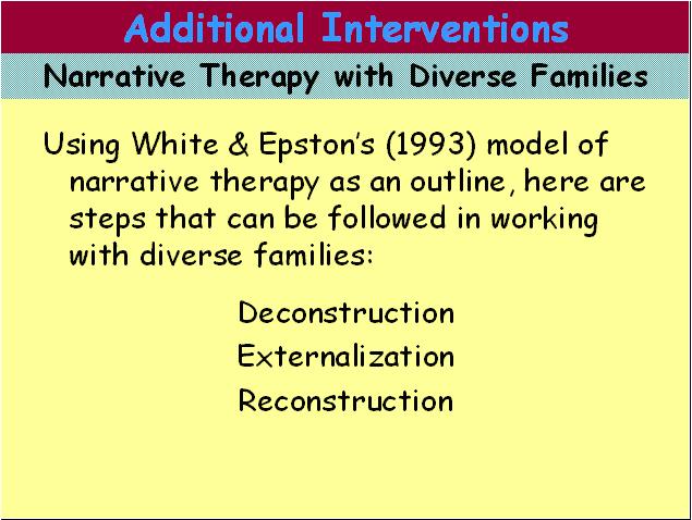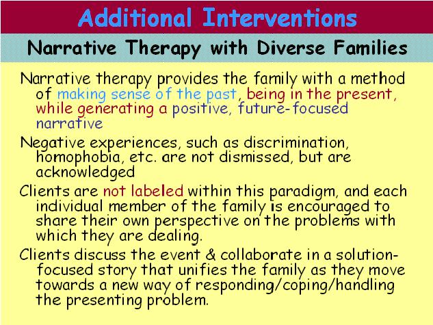 14 Question 14 | Test | Table of Contents Now we’ll go to narrative therapy that Kim will share with you. Narrative therapy can be very effective with diverse families. Number one reason is that it externalizes the problem. Instead of laying the blame on the family for being different, it externalizes it, it says it’s not your fault for being different, it’s a societal issue. You’re trying to fit into a society which is not as accepting of you and your family. So that can be very powerful for the family. It lets them tell their own story that we’ve been saying is so important. They can bring in other family members, it helps them get a better understanding of each member’s perspective. You can have each family member write their own little narrative and then share that within session to see their different views of how they see the family. With role model families accessible, these families can create their own definitions of family. So compared to what we might consider a “role model” family, where do you guys fall? How do you fit? And then they can construct their narrative, their story, their meaning for what’s healthy functioning in their family. This goes on to describe a little bit more of the details. Just that you want to give them a method for making sense of their past, their present, the positive, and make sure hopefully it’s a positive focus on the future, that things will get better from here. Negative experiences, discrimination, homophobia, you don’t want to dismiss them, you want to acknowledge that they have been there but how can we move on, how can we move past this, how can we learn to cope with this? They’re not labeled within this format. Each individual family member is encouraged to share their own perspective on the event and collaborate in a solution-focused story, so you have all the family members come together, they tell their narrative, and maybe they don’t quite fit. So how can we get this to all fit together? What’s the solution? What way can we get these stories to connect and be one story about your family? Using White and Epston’s Model for narrative therapy as an outline can be very effective and the steps that the outline provides are the deconstruction, externalization, and reconstruction of the family. So breaking down what has been, externalizing the problem, reminding the family that it’s not their fault for being different, it’s the society that you’re living in, and reconstructing it, how can we make something better, something more positive out of this for you. Very much empowers the clients and helps them advocate for themselves. All these interventions we suggest are ones that give clients the power to make sense of what’s happening for them and help them find ways to solve the problems on their own. Instead of saying, “You’re different, that’s a negative thing, you’re not capable of solving your own problems,” “You’re different, that’s great, tell me what you're going to do next to solve these problems that are facing you.” Always give the power back to the client so the clinician doesn’t have to feel that they're in the hierarchical role. There’s more very much collaborative and collegial which I think is important because it helps the families dealing with difference believe in themselves and advocate for themselves. Below