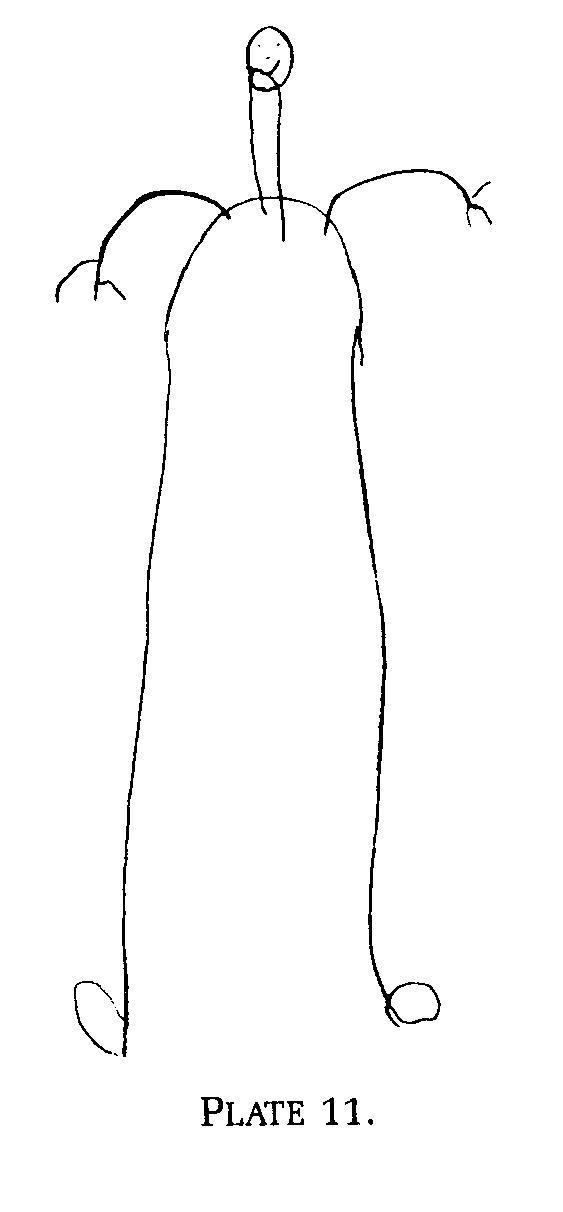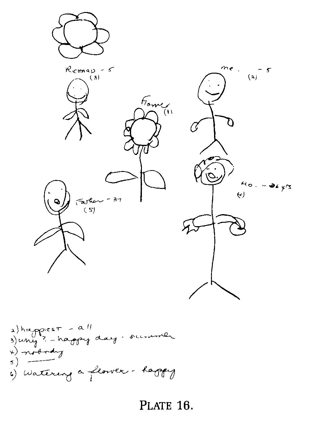 Kinetic Family Drawing (Plate 16) present people wearing a smile. Yet, the other parts of the figures belie these joyful expressions. Particularly, in the KFD, the family members look much like unrooted flowers waiting to be plucked. Roger's distress is further echoed In the HFDs, where we note the short, flimsily connected arms. Machover (1980) states that arms and hands refer to "ego development and social adaptation. It is with arms and hands that we feed, dress, perform skills, explore our body and contact persons about us. It is with arms that we love and caress, hurt and kill, disrupt and adapt" (p. 80). Roger's treatment of arms in his drawings depicts his difficulty in ego development and socialization. However, we also notice that, despite their weakness, the arms extend outward Into the environment representing his desire for contact. Sadly, however, his ability to achieve this is impaired. This helplessness is further confirmation of the message conveyed by the encapsulated branch structure In Plate 15. A final noteworthy point is the reflection of Roger's anxiety.