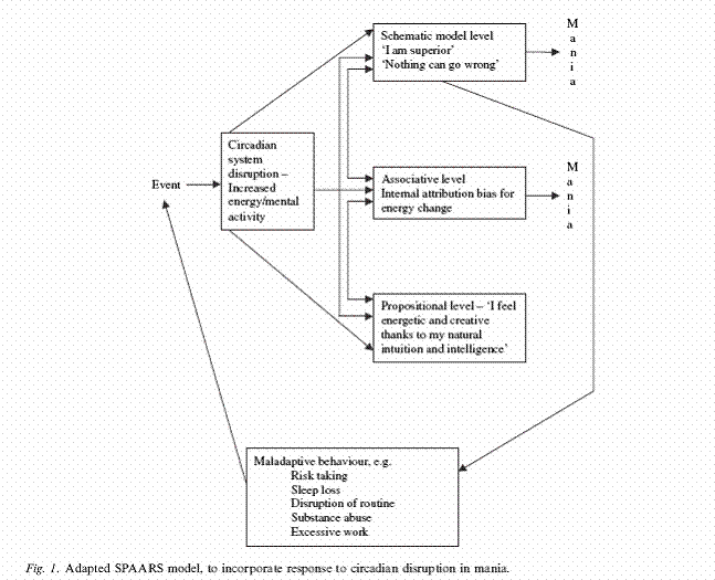 Section 17 Question 17 | Test | Table of Contents Need for an integrative model One influential model for the development of treatment approaches has been the instability hypothesis which suggested that vulnerability to disruption of circadian rhythms is fundamental to BD. Circadian rhythms are patterns of physiological activity that cycle over an approximately 24-h periods including sleep, body temperature, cortisol and melatonin secretion. Circadian rhythms are entrained by both physical (e.g. light/dark) and social/behavioral zeitgebers. Numerous studies have reported disrupted circadian rhythms in acutely ill BD patients. More recently, studies have found sleep and activity disruption in remitted BD patients suggesting that it is a trait factor. Monk et al. social rhythm metric (SRM) assesses the extent to which individuals have a stable activity pattern, as a proxy measure of circadian functioning. Psychological treatment can have a significant effect on SRM, whilst instability on the SRM is associated with elevated risk of mood episodes in individuals with cyclothymia or BD II. This proposed vulnerability and its interaction with psychosocial events, stimulated the development of Interpersonal and Social Rhythm Therapy (IPSRT) which combines standard IPT with development of stable patterns of regular activity. IPSRT is associated with stabilization of social rhythms and with longer euthymic periods than clinical management; but to date there is no evidence of a differential impact on relapse rates or mood symptoms. A multilevel model approach to integration Jones proposed a model of BD integrating circadian instability with psychological functioning which builds on the work of Healy and Williams. The model uses a multilevel approach to cognition and emotion to explore how circadian instability might lead to the observed clinical symptoms of BD. Single-level models of emotions, such as those of Beck et al., have limitations with respect to BD. The illness course of many BD patients is characterized by extended periods in mixed emotional states, where for instance elevated mood and irritability/anger co-occur. Any model therefore needs to accommodate the generation of parallel and even potentially conflicting emotional states. Jones_ model is therefore based on the Schematic Propositional Analogical and Associative Representation Systems (SPAARS) approach of Power and Dalgleish. In SPAARS external events are first processed analogically; a rapid and modality specific level. Further processing at a propositional level employs abstract language-based models [similar to automatic thoughts within Beck’s model of depression]. Direct emotional outputs occur via schematic and associative levels. Schematic processes integrate information from all other processing systems into knowledge at a level _beyond verbally expressible propositional concepts. The contrast here being between _prose_ description at a propositional level and _poetic_ description at the schematic level. Schemas are dynamic and flexible with respect to changing inputs from other levels and guide behavior. The associative level permits events, either through repetition or through salience, to trigger emotional output. It also allows for different emotional outputs at different levels of the system (such as the phobic patient who _knows_ that the feared object is harmless, but _feels_ they must continue to avoid it). This model suggests circadian rhythm disruption is an important factor in triggering episodes. However, many other groups experience circadian disruption without experiencing bipolar episodes. What makes BD patients especially vulnerable? Jones draws on evidence from the psychological literature indicating that individuals with BD make internal attributions for both positive and negative events which suggests that when experiencing the effects of circadian disruption they will also make internal attributions. Additionally, Robbins and Kirmayer found individuals with a chronic psychiatric history (not restricted to panic disorder patients) have a greater tendency to make internal psychological attributions for common somatic experiences, whilst individuals at risk of BD also tend to make more positive internal attributions for physiological changes associated with hypomania. These factors suggest, not only that individuals are more prone to circadian instability, but also that the interpretations they make may lead to behavior which exacerbates these fluctuations. Figure 2 illustrates how this development of the instability hypothesis might integrate a range of psychological findings with respect to BD, referred to previously in this paper. In particular it is proposed that the avoidant or ruminative coping styles in response to initial mood changes can place the individual at risk of developing prodromal mood states. Whilst distraction has been reported to have benefits in unipolar depression, high-risk studies have reported associations between hypomania and both distraction and engagement in dangerous activities. It has been shown that poor prodromal coping styles for depression (withdrawal and rumination) and mania (sensation seeking/risk taking, increased goal directed activity) are associated with poorer social functioning and higher risk of relapse. Figure 2 indicates that avoidant coping styles (sensation seeking or risk taking) might relate to the _manic defense_ hypothesis. This suggests mania is triggered by efforts to avoid low mood. Although not conclusive a number of studies indicate BD and unipolar participants exhibit similar levels of pessimistic attributional styles on implicit tests, whereas BD participants show an opposite pattern on explicit attributional measures. Furthermore, both behavioral high-risk and depressed and manic BD participants exhibit attentional biases to depression but not mania-related words in an emotional Stroop paradigm.