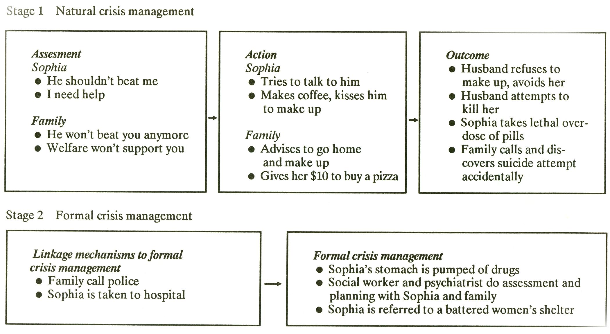 Another woman said that her usual way of coping with the trauma of battering was by overeating, a device she also used before she was ever battered. The terms 'illness', 'unhealthy', or 'destructive' can certainly be used to denote addictions and assaults on oneself and others in response to the stress of being battered. Regardless of how such negative coping devices are labeled, however, the women's accounts in this chapter support the earlier suggestion that stress, crisis, and illness (physical, emotional, mental) are interactionally, not causally related (see Figure 4.1, p. 70). Figure 4.1 suggests that stress not only precedes but also follows a battering episode, and that emotional crisis may or may not be part of the total episode. These findings also support the work of Hilberman (1980) in which mental and emotional disturbances of battered women were found to follow rather than precede battering. Analysis thus far reveals not so much a failure of coping by individuals as it does the limitations and misdirection of personal coping responses (natural crisis management) to certain traumatic life events. That is, suicide, assault, addictions, and emotional disturbance are forms of coping, though most people would regard them as unhealthy or ineffective (Caplan and Grunebaum 1967; Hoff 1989: 60-2). Put another way, 'natural crisis management' needs to be supplemented by 'formal crisis management', assistance from sources beyond the individual and immediate family. The need for both personal coping strategies and social support has profound implications for the successful resolution of crises around battering. In Sophia's case the initial support she received from her family was misdirected, e.g. 'You go back ... he won't do it anymore ... Welfare won't support you .Here's $10, go buy a pizza and forget everything.' Only after a near-fatal suicide attempt were institutional networks mobilized, and these only for emergency rescue purposes. Prior to this destructive crisis outcome, however, crisis management did not go beyond the 'natural' level. The suicidal outcome of the crisis suggests that 'formal crisis management' was needed as well. The distinctions and relationship between natural and formal crisis management as applied to battering are illustrated in the Figure below. - Hoff, L. A., MA. (2000). Battered Women as Survivors. London, England: Routledge. Effective Intervention in Domestic Violence & - Schechter, S. & Edleson, J. L. (1999). Effective Intervention in Domestic Violence & Children and Domestic Violence: The Prosecutor's Response
