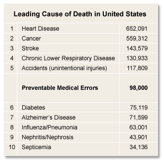 The Institute of Medicine’s (IOM) seminal study of preventable medical errors estimated as many as 98,000 people die every year at a cost of $29 billion.[1] If the Centers for Disease Control were to include preventable medical errors as a category, these conclusions would make it the sixth leading cause of death in America. [2]