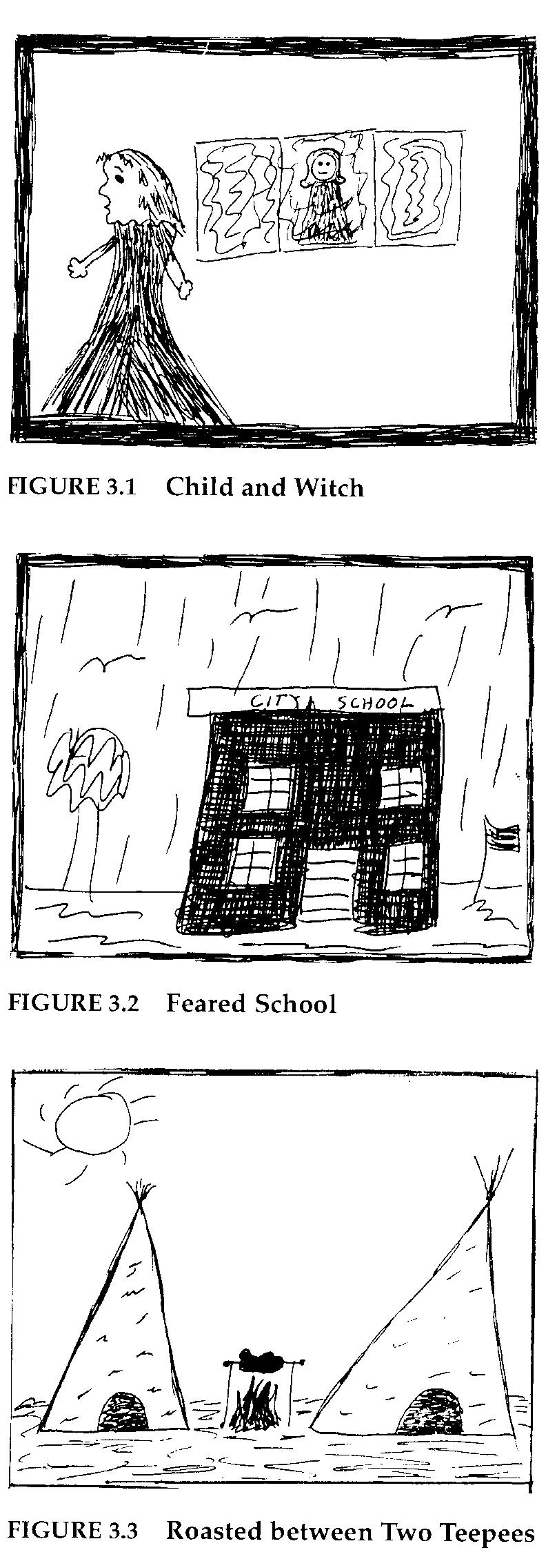 Althea G., age eight, was referred to the mental health clinic by her pediatrician for failure to attend school, fear of leaving home, anxiety about failing to perform adequately, nightmares, and morning nausea unrelated to physical illness. Her symptoms had worsened over the last two years. Two years ago, her maternal grandmother died. Her sister also entered school about this time. Biopsychosocial assessment revealed Mrs. G.'s depression, Mr. and Mrs. G.'s marital conflict, and Althea's school-phobic anxiety. Mrs. C. entered treatment for depression. Mr. and Mrs. C. were seen together biweekly for marital counseling and parental guidance work. Althea began play therapy and immediately expressed her concerns and issues through drawing. In her first drawing (Figure 3.1), Althea expressed her fears and anxiety about therapy by drawing herself in a window placed between two empty windows and guarded by a witch. She drew borders on her early pictures to contain her anxiety and avoid spill over The remaining figures illustrate the ongoing metaphors and process themes throughout her year of treatment. Figure 3.2 is representative of early drawings of her feared school - a dark building that has bars on the door and windows and is located in a dreary environment. Figure 3.3 picks up on her concerns and fears about leaving her parents and conveys a sense of self caught between two parent teepees and roasted over fiery feelings.