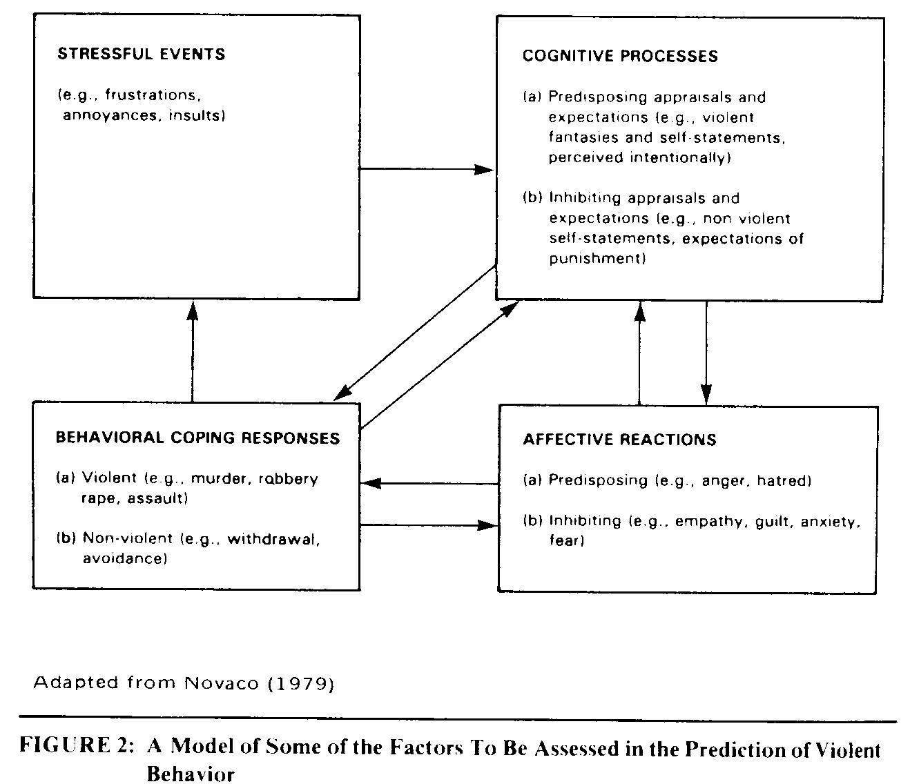 Both expectations and appraisals may be reflected in the "private speech" or self-statements a person uses regarding violent behavior (e.g., "Anybody who insults my wife gets hit."). Violent delusions and fantasies may be thought of as extreme forms of such private conversations and statements of intention that are directly verbalized (i.e., threats of violence) may be particularly significant. For our purposes, appraisals and expectations may both be categorized as cognitive factors that "predispose" toward or "inhibit" violent behavior. These cognitive processes, in turn, may either give rise to certain affective or emotional reactions or may directly propel a behavioral response. One need not be emotionally aroused to commit violent acts (e.g., the stereotypic "hitman" of Godfather fame). If, as is more typical, affective reactions are intervening, they may be viewed as either of a predisposing or an inhibiting type. Affective reactions predisposing a person toward violence would include the emotions of anger and hatred. While anger is not necessary for the occurrence of violent behavior, its arousal is a significant antecedent to aggression (Rule and Nesdale 1976). Fortunately, excellent work on the clinical assessment of anger is currently available (Novaco 1975, 1976, 1978, 1979). Affective reactions inhibiting violence (or, to put it more positively, predisposing toward peacefulness) include what have been called the "moral emotions" of empathy for the source of a frustration and guilt about injuring another, as well as anxiety reactions about engaging in violence or about the victim's possible retaliation. The lack of capacity for such affect has been viewed as the hallmark of the "sociopath" (Dinitz 1978). In a state of alcohol or other drug-induced intoxication, many factors that ordinarily would serve to inhibit violence may be suppressed. The likelihood of such suppression should be estimated. These affective reactions are then behaviorally expressed in terms of a coping response which, for our purposes, may be dichotomized as violent or nonviolent. The type of response chosen may go on to influence further stressful events, as would be the case when a divorce would eliminate interaction with a frustrating spouse or murder would precipitate the stresses of imprisonment. Whether or not a given coping response attenuates or exacerbates further life stresses would have relevance to whether a given level of violence potential could be expected to increase or decrease. As Toch (1969) emphasized, violence may be thought of as interactional in nature. If one person's coping response (e.g., insulting a person perceived as a threat) leads the other to escalate his or her provocations, violence may eventually ensue. Several of the relationships expressed in figure 2 are bidirectional (as indicated by the arrows). This is meant to indicate that affective reactions can influence cognitive processes (e.g., "I feel so upset that I must be really angry") and that behavioral responses can affect both cognitions (e.g., "I hit him, therefore I must want to hurt him") and emotions (e.g., "I avoided her, therefore I must be angry at her"). The Novaco model of anger, as adapted here, is not exhaustive of the factors that influence violence. Demographic and historical factors, for example, are not addressed (hence, we inquire into them elsewhere in the assessment). But as a depiction of the cognitive and affective factors involved in violent behavior, the adapted Novaco model seems to capture well the essence of much of what must be assessed in violence prediction. The kinds of stressors in which we are interested are those likely to be met with violent coping responses; While the kinds of stressors (e.g., frustrations, annoyances, insults, injuries) likely to result in violence are dependent upon the ways in which the individual cognitively and affectively processes them, and in fact may be thought of as fundamentally idiosyncratic in nature (see the next question), some general commonalities may exist among the kinds of situational demands likely to lead to violence. Based on the earlier analysis of the situational correlates of violent behavior (chapter 5), at least three broad areas of concern suggest themselves. 1. Family stressors. The frustrations and