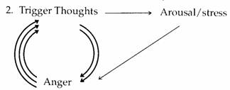 Section 20 Question 20 | Test | Table of Contents Anger is a two-step process. It usually starts with stress and the subjective experience of arousal that stress of any kind generates. Stress motivates you to begin coping. You want to lower or block these uncomfortable feelings. The first step in anger production concludes when your awareness of stress leads to a coping decision. While coping could include tears, relaxation, exercise, music, verbalizing, or problem solving, too frequently you may find yourself choosing to block and discharge pain through anger. As you’ve seen, stress is not a sufficient cause for anger. You need the psychological flint of anger-triggering thoughts to convert stress into hostile affect. Step two in anger production is the process by which you focus on either blamers or shoulds. Blamers. Here the generic thought is "you deliberately did _______ to me." The key idea is that you have been intentionally harmed by the wrong behavior of another. Shoulds. The generic thought here is "you should not have ______ but instead you should have _______." The implication is that the person knows or should know how to act correctly and has, out of stupidity or selfishness, broken the rules of reasonable conduct. Both kinds of trigger thoughts have, as a core belief, a perception of the other person as bad, wrong, and deserving of punishment. When Leonard says to himself, "They deny me the chance to relax," the implication is that Sarah and James are deliberately harming him. They are bad and should be punished. When Sarah says to herself, "Everyone must do his job," she sees James as breaking a basic rule of life. He is doing wrong and should be punished. When James blames his mother for trying to control him, he sees her as the "field marshal" deliberately inflicting harm. His response is to want to hurt her back. Stress (painful arousal) plus trigger thoughts equal anger. You cannot have anger without both components being present. Trigger thoughts without arousal produce a judgment without emotion. Arousal without trigger thoughts leaves you in a chronic state of pain until you choose an alternative stress reduction strategy. The Anger Cycles 1. Arousal/stress --------------------> Trigger Thoughts In cycle two, the trigger thoughts create a stress reaction (however brief), which then fuels anger. Some trigger thoughts are sufficiently provocative to create arousal where none previously existed. Arthur wonders if his wife will work long hours at her law office again tonight. The image of himself sitting through news shows and sitcoms waiting for her key in the door triggers a deep sense of abandonment. But he thinks that the pain is her fault. Almost instantly he converts the stressful feeling into anger. Now the anger stirs more trigger thoughts: "She doesn’t care really about our marriage—there’s that weekend where she decided to go away by herself, and the habit of reading in bed, and the fights about who was supposed to shop." Arthur is now caught in the feedback loop. Trigger thoughts breed more anger, which sets off more trigger thoughts, followed by more anger, and so on. In cycle two, there is always an intervening moment of pain (loss, rejection, despair, fear, frustration, hurt, abandonment) between the trigger thought and the anger. But the perception that the pain is someone else’s fault quickly ignites the anger and establishes the feedback loop. Personal